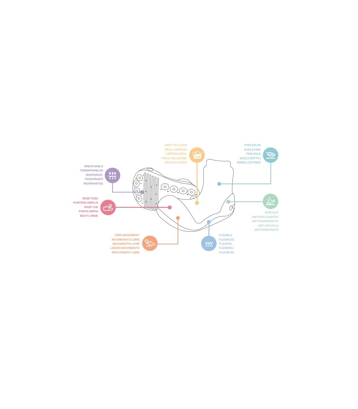 La libertad de movimiento en deditos mejora el desarrollo cognitivo y motor por eso nuestra puntera es amplia y flexible.