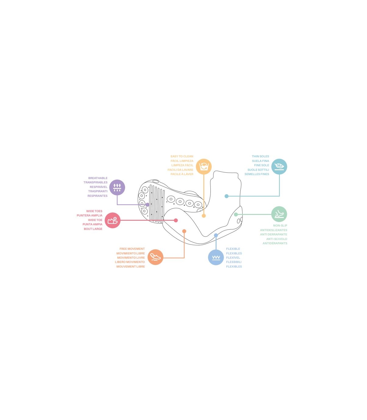 La libertad de movimiento en deditos mejora el desarrollo cognitivo y motor por eso nuestra puntera es amplia y flexible.