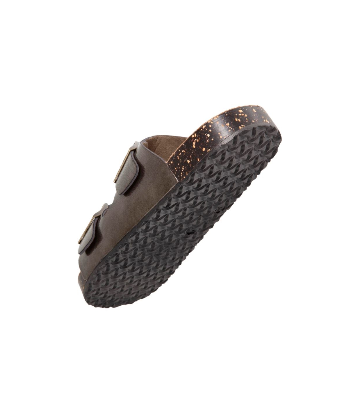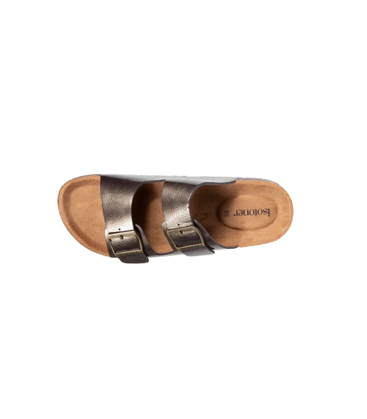 Chanclas de dos hebillas tipo bio en charol metalizado plomo.