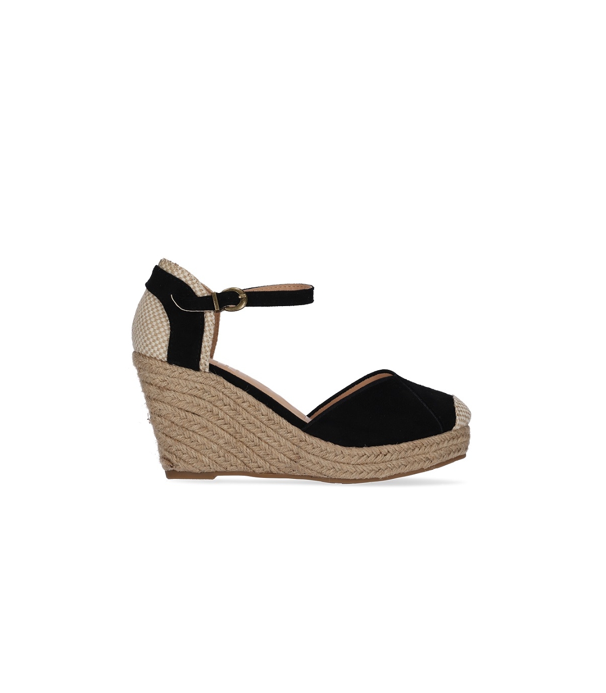 Sandalia de señora con cuña de yute en ante negro.