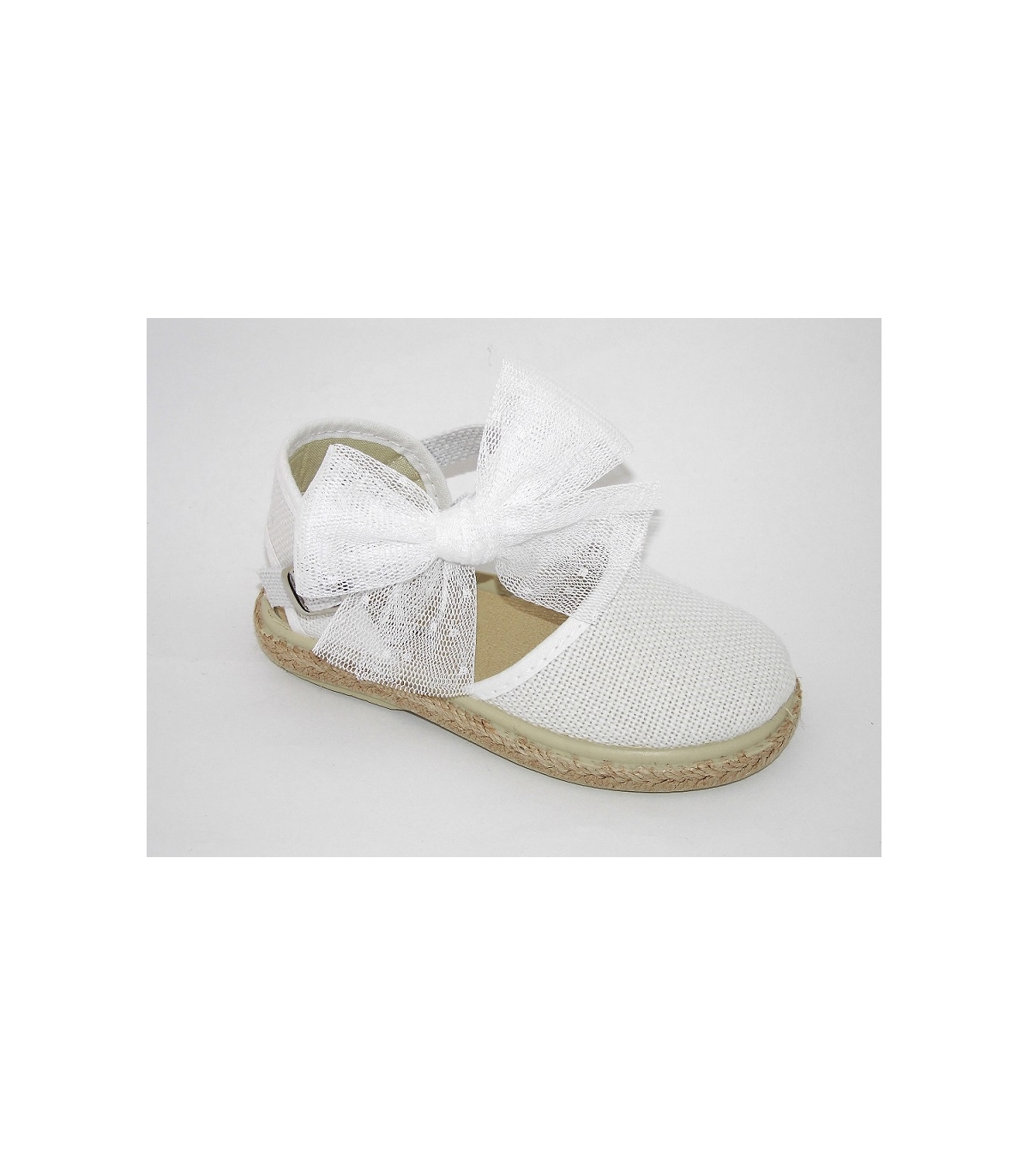 Lona esparteña lino blanco con lazo de tul con topitos al tono.
