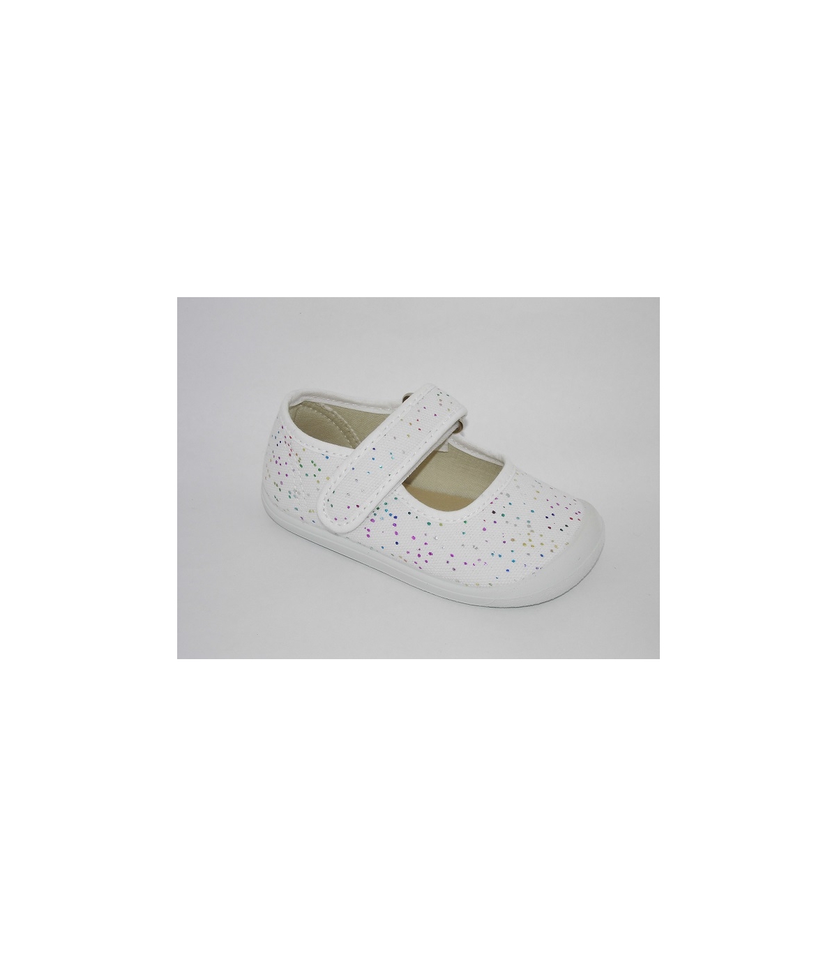 Merceditas BAREFOOT de lona blancas con puntitos en metalizado multicolor.