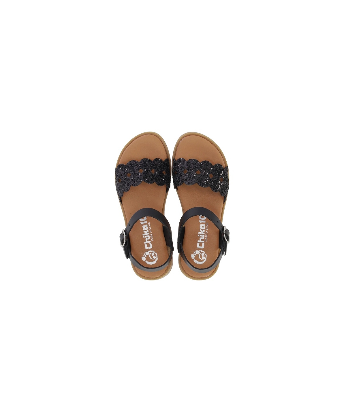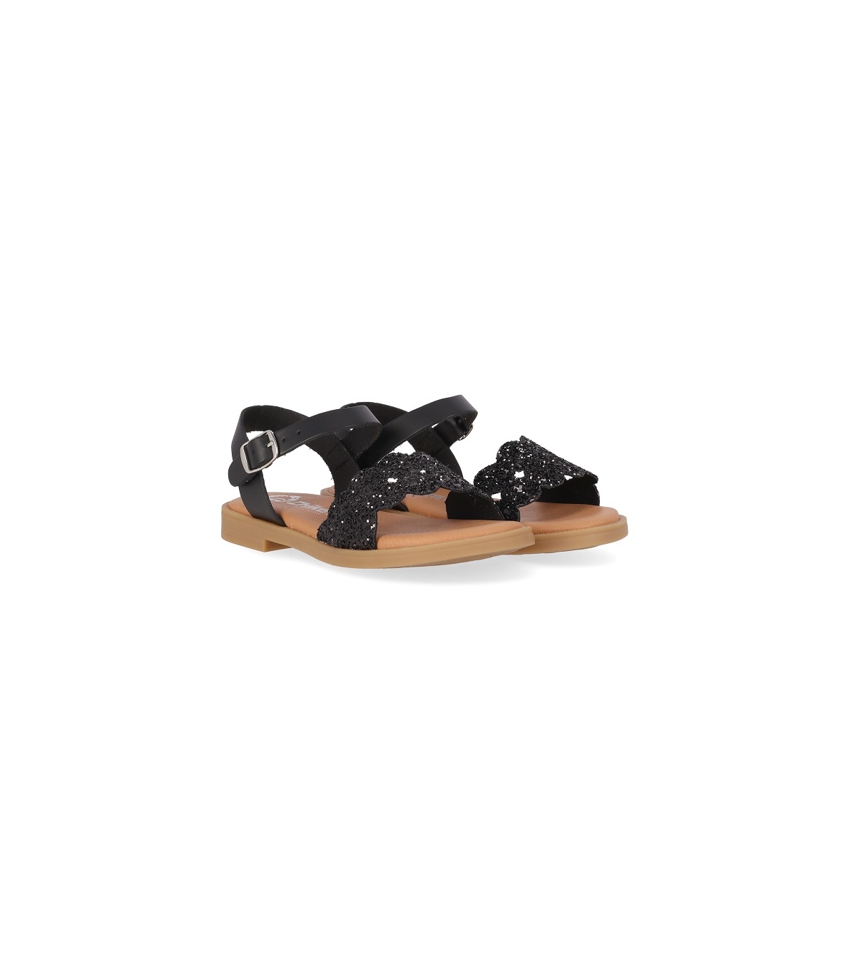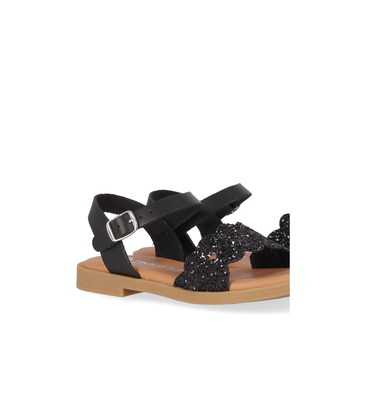 Sandalias toqueladas combinadas en piel vegana y glitter negro.