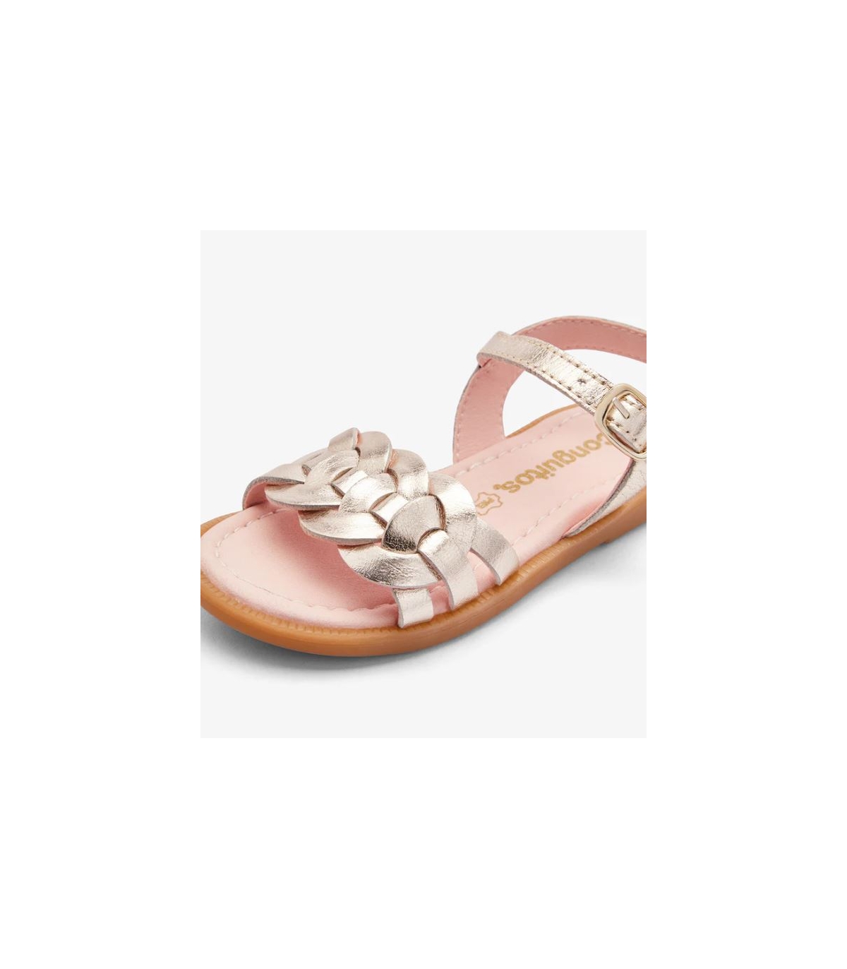 Empeine de piel con acabado metalizado y detalle de nudo trenzado.
