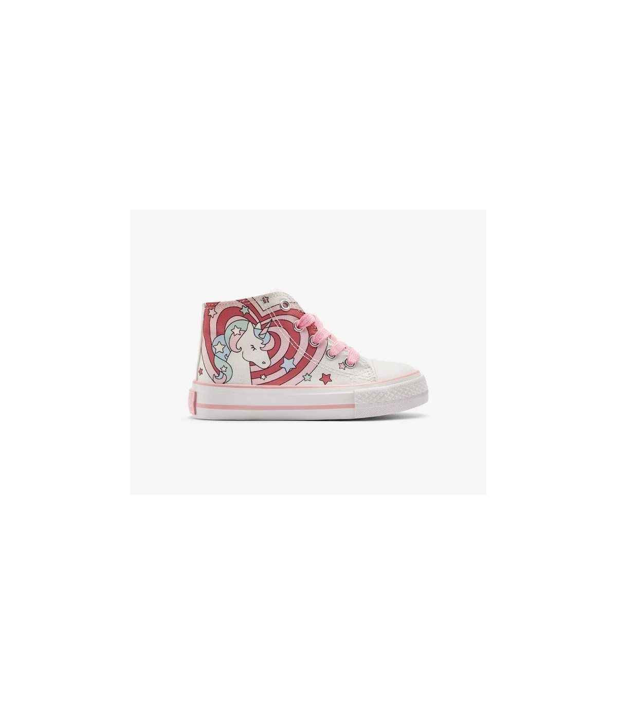 Estampado de unicornio rodeado de estrellas, detalles en tonos rosados y corazón que CAMBIA DE COLOR CON LA LUZ SOLAR.
