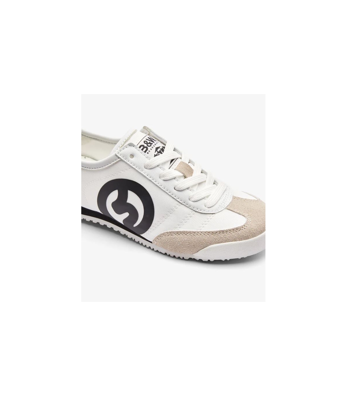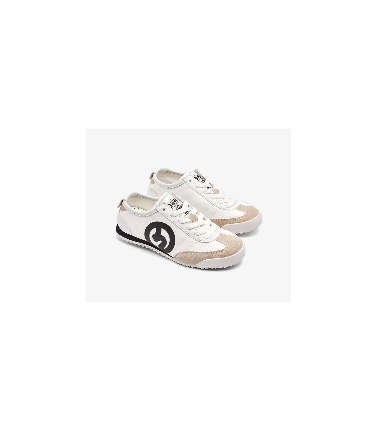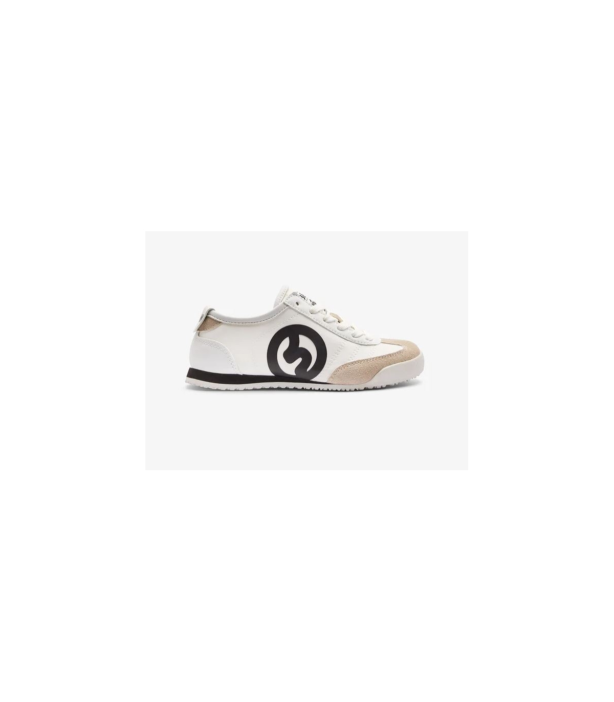 En color blanco, con detalles en serraje beige y el logo en contraste.