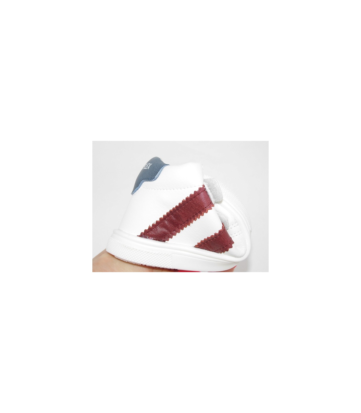 Con detalles de rayas en burdeos y talonera en azul.
