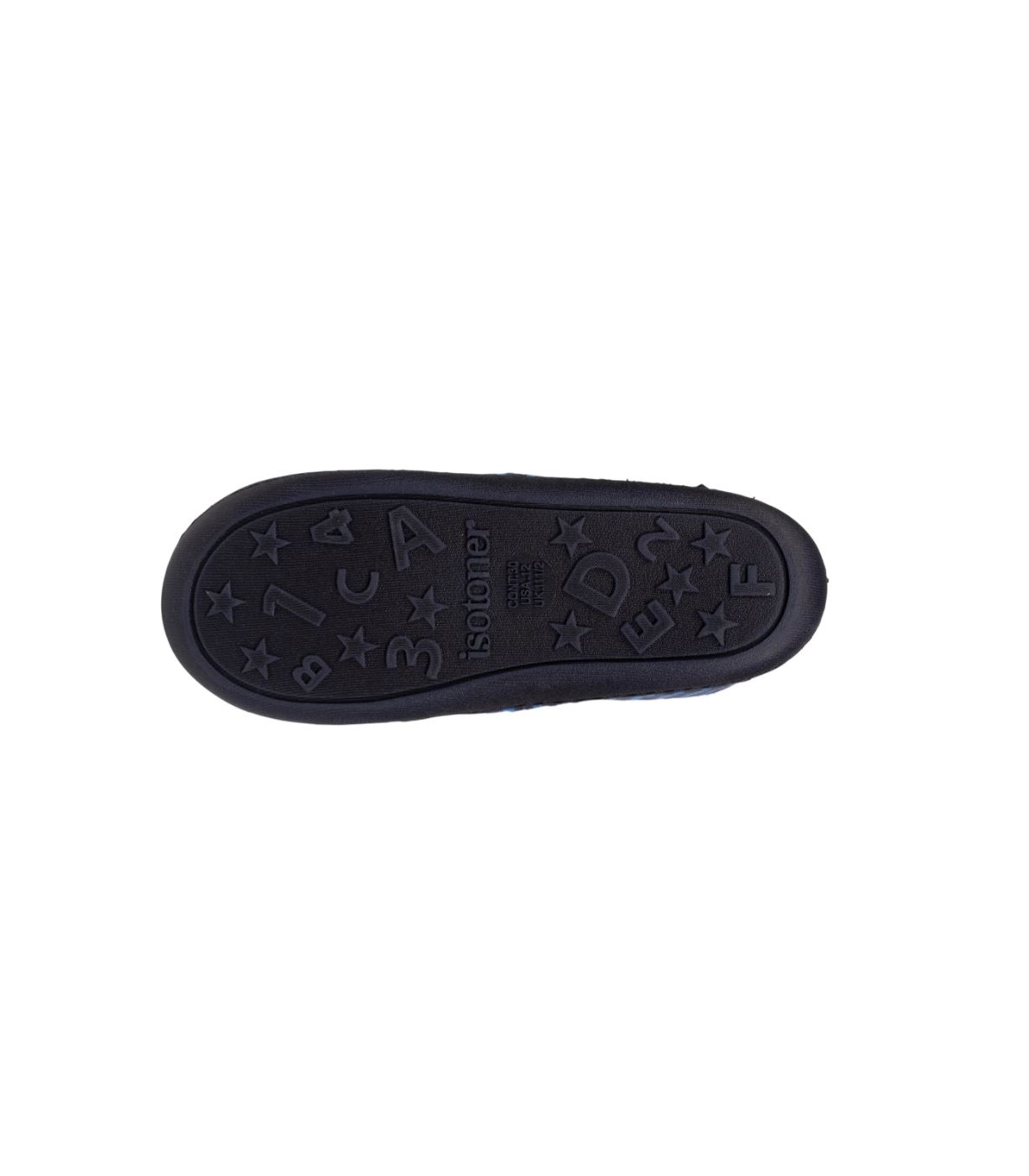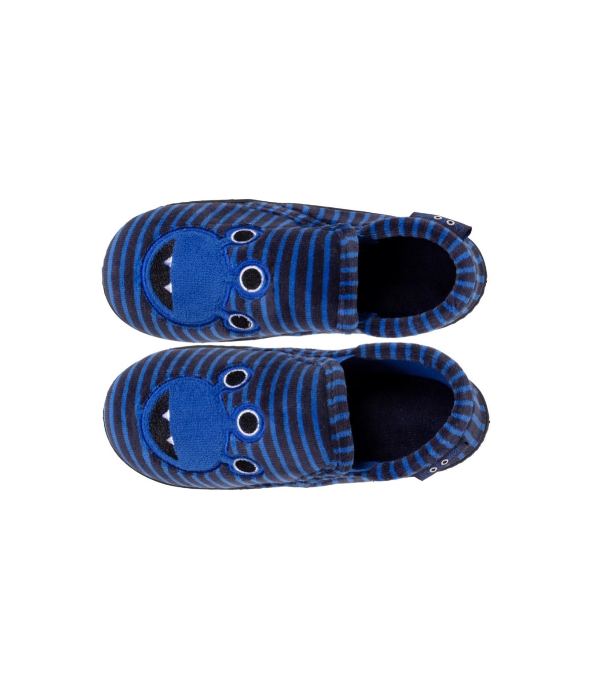 Zapatillas de casa tipo botines en azul con rayas y dibujo de monstruo.